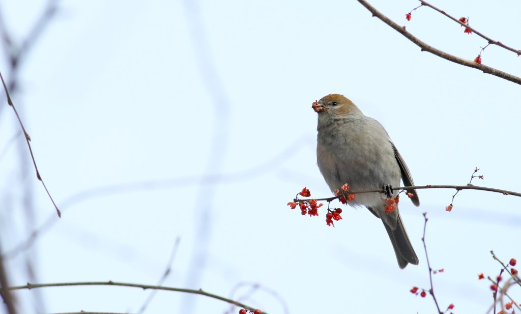 Once we arrived at our destination, the town of North Conway, NH, we were struck by how few and far between the birds actually were. On several occasions we walked for hours in the snow-covered spruce woods and could find little more than a few black-capped chickadees. However, one day my brother called me outside early in the morning to point out a flock of four pine grosbeaks sitting in the top of a tree just outside our house, munching on berries. They were puffed up against the cold, making them seem even larger and rounder then they normally do. It was only the second time we’d ever seen the species, the first being in Glacier National Park several years ago.