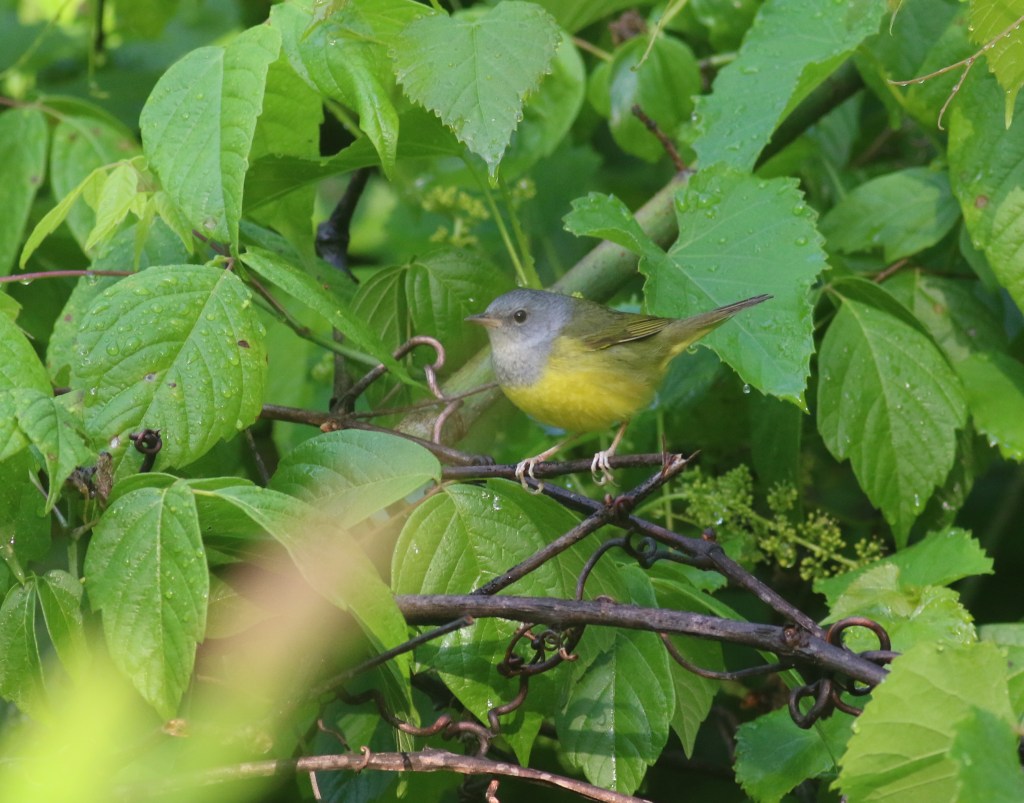 As we walked back north along the Riverview Park trail, we encountered a small group of active chickadees, vireos, and gnatcatchers. Hoping the small mixed flock might contain other species, my brother began making “pishing” noises to attract the birds. Suddenly, a chunky, olive yellow bird flitted across the path. Hoping it might’ve been a mourning warbler, we redoubled our efforts. Sure enough, a few seconds later, the mourning warbler popped back up on top of a tangle of grape vines. It had a complete pale gray hood, pink legs, a yellow underside, and the very faintest traces of eye arcs.